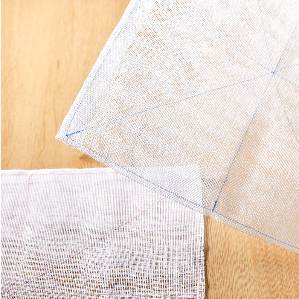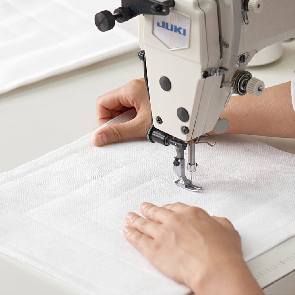 一枚の蚊帳生地を八枚重ねにし、ミシンステッチで丈夫に仕上げています。