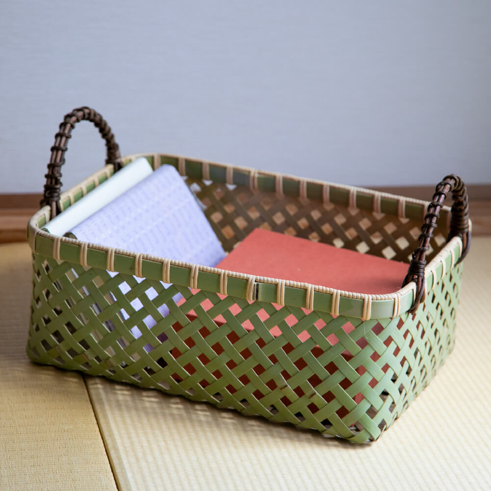 緑、白、濃茶のアクセントが魅力的な持ち手付きの竹かご。