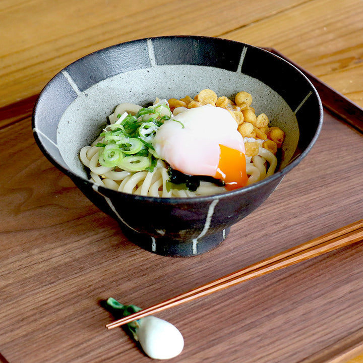 外側の緩やかな丸みが手に優しくフィットし、程よく開いた口元と形状と厚みが、箸で掴んだ麺をスムーズに口へと運びやすくします。