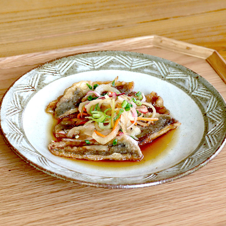 丸みを帯びたシンプルな形状は、どんな料理も盛り付けやすく、食材そのものの美しさを際立たせます。少し深さがあるので、煮物や煮魚の盛り付けにも◎