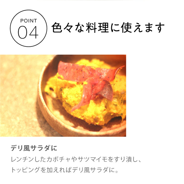 レンチンしたカボチャやサツマイモをすり潰し、 トッピングを加えればデリ風サラダに。